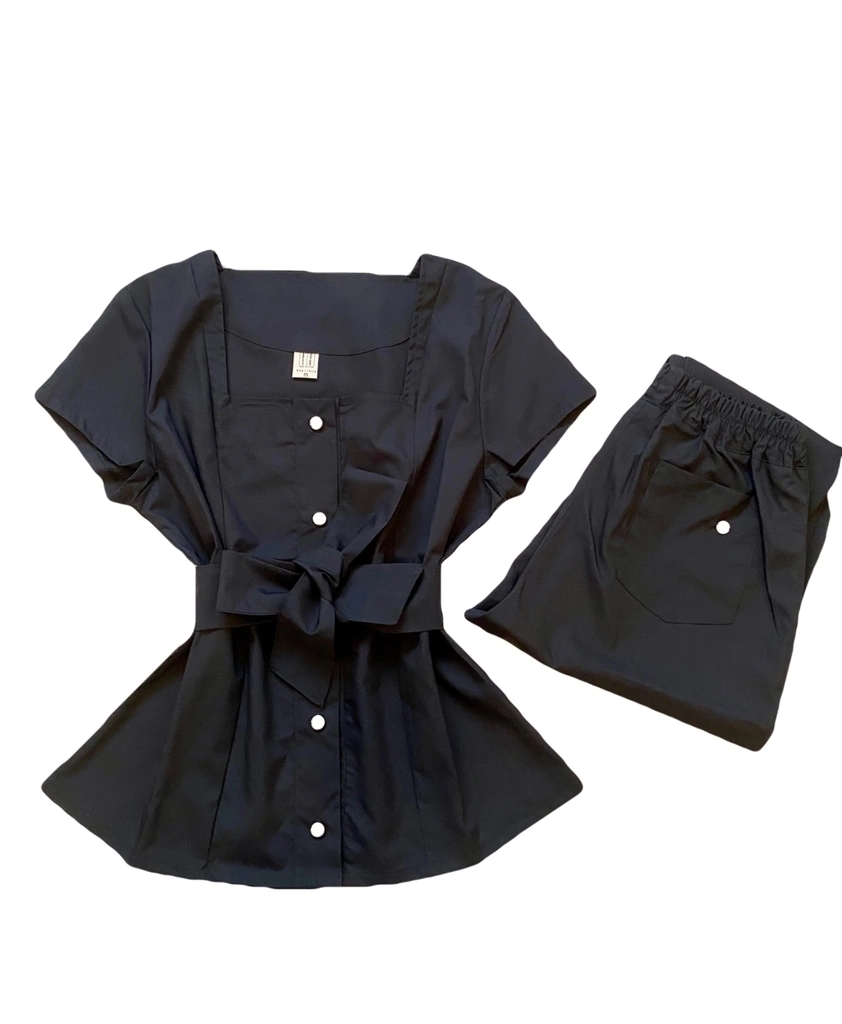 La chaqueta es semi entallada con lazo completamente desmontable, o sea se puede usar o no, ya que no contiene presillas, escote cuadrado y